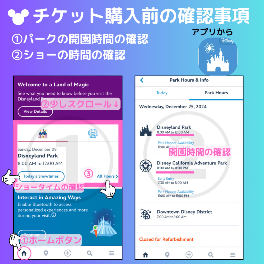 - チケット購入前の注意点(開園時間、ショーの時間)