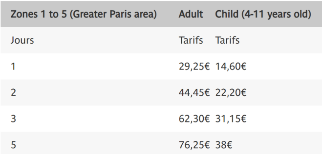 ↑こちらは観光客用のチケットです。5日間パリに滞在かつ、パリから少し離れたところにも観光したい方はこちらがおすすめかと思います。そしてこちらは空港までの料金も含まれています。