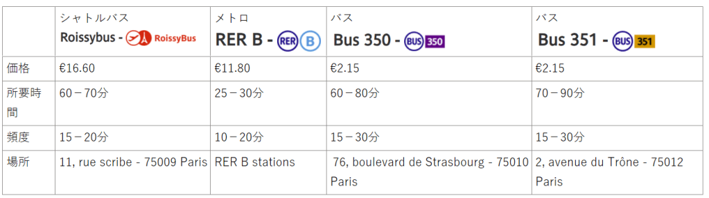 一番最初に紹介した片道€2.15の電車チケットは市内ー空港では利用できません。CDG(シャルルドゴール空港)からパリ市内、パリ市内からCDGは専用のチケットが必要になります。路線バス、空港専用シャトルバス、メトロで空港に行くことができます。