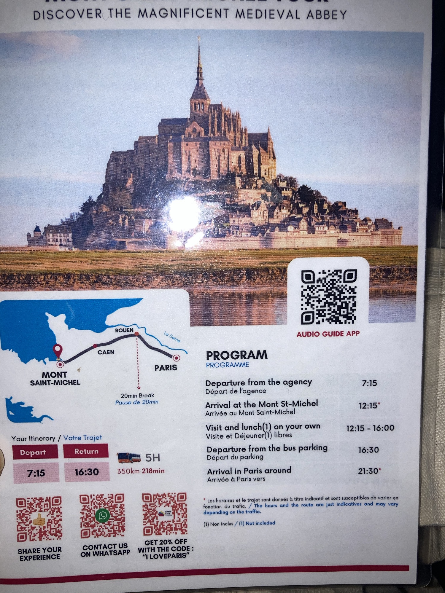 バスの中で配られたパンフレットです。ツアー代にはモンサンミッシェルの修道院の入場チケットも含まれています。