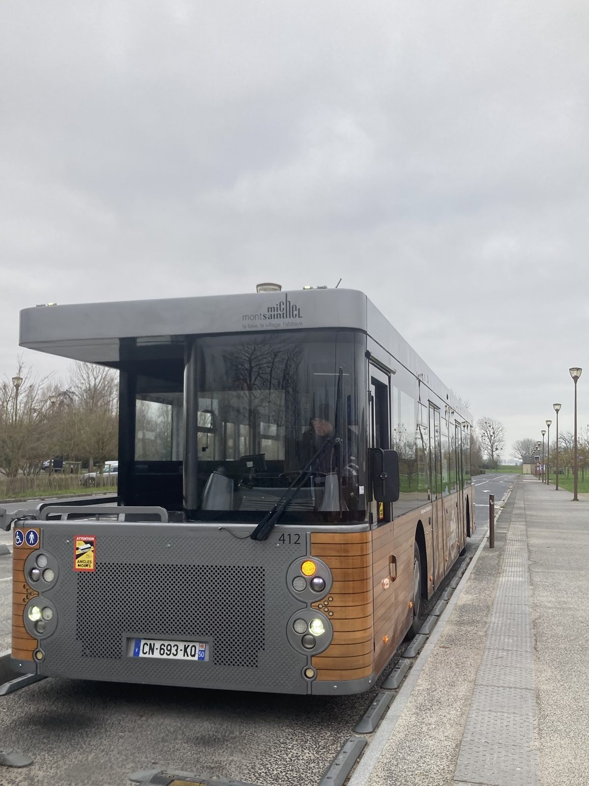 こちらがそのバスです。シャトルバス乗り場まで案内され、16時半にあの建物(ビジターセンター?)で集合ですよーと言われ、解散、自由時間となります。ちなみに12月半ばのノルマンディーはとってもとっても寒かったです。風も吹いていてスマホの充電がなくなりそうなほどでした。防寒必須。5℃くらいでした。