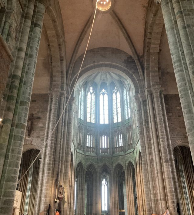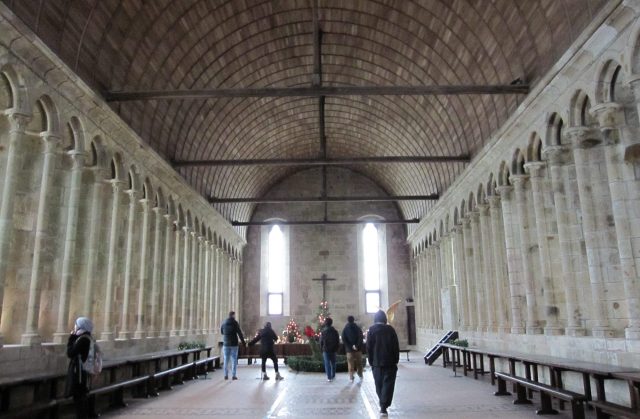 708年:アヴランシュの司教オベールが「大天使ミカエル」の啓示を受け、島の岩山頂に小さな礼拝堂を建設。当初はごく簡素な宗教施設でしたが、巡礼地として有名になり、修道士が定住し始めたそうです。その後ノルマンディー公の庇護を受け、規模が拡大。