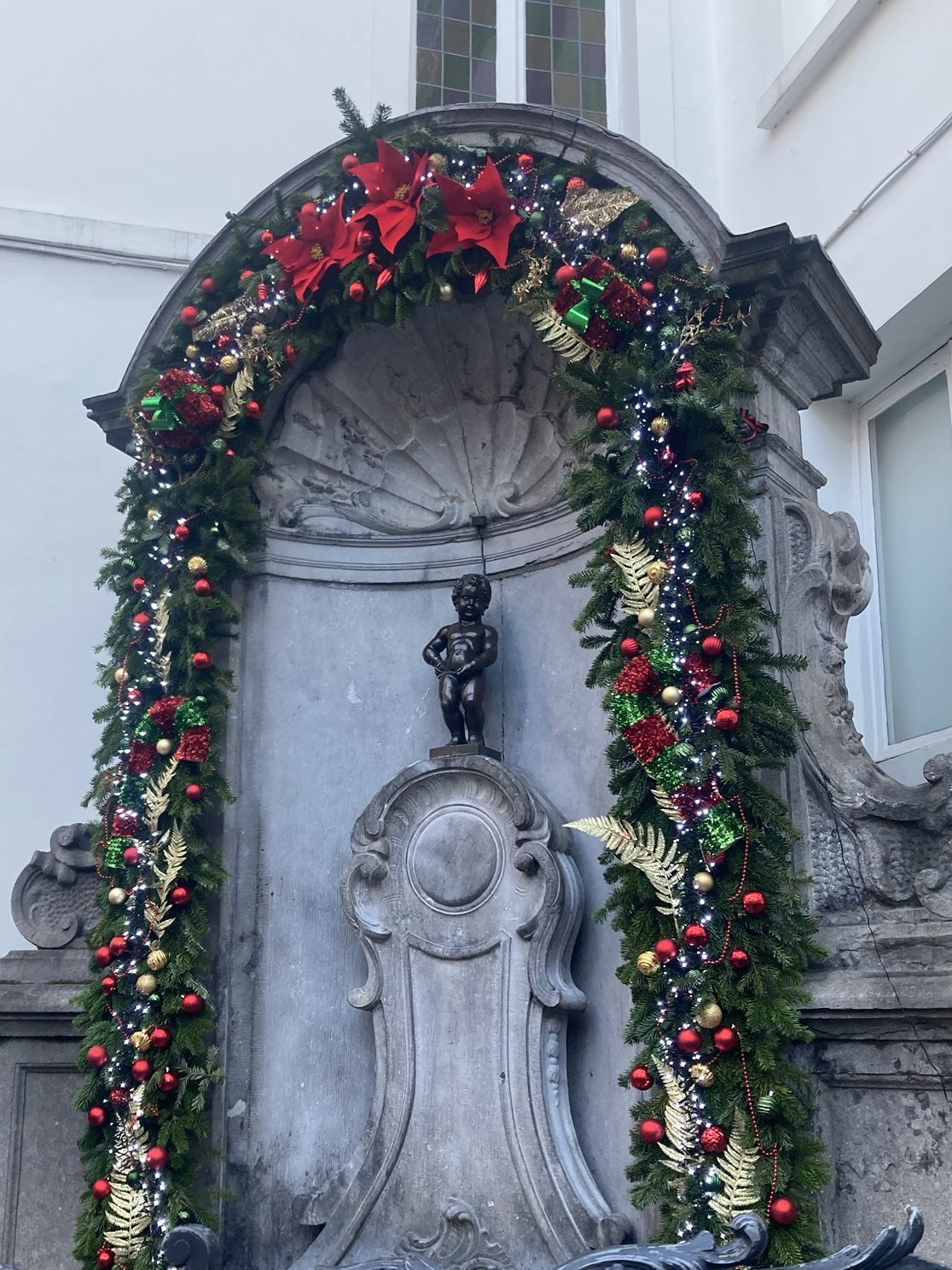日本ではDAKARAという清涼飲料水でおなじみの小便小僧です。1619年に彫刻家ジェローム・デュケノワ(Jérôme Duquesnoy)が制作しました。都市伝説的な由来が複数あり、例えば「敵の爆弾の導火線に小便をかけて街を救った少年」などがあります。国の象徴的存在で、特別な日には衣装を着せ替えることもあるのですがこの日は服を着ていませんでしたが、周りはクリスマスの装飾がされていました。