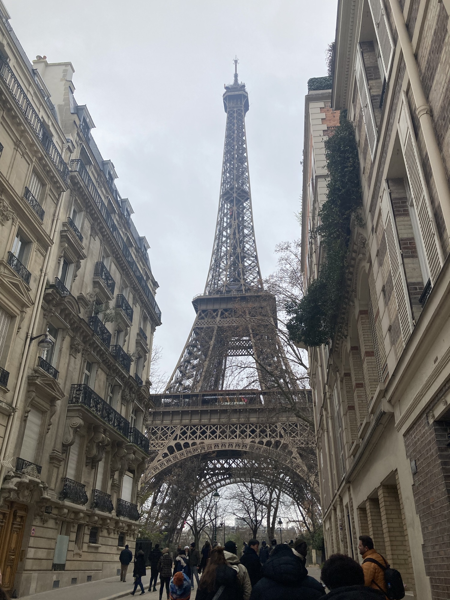 1889年パリ万博のために建設された鉄塔。高さ約330m。ギュスターヴ・エッフェルによって設計され、当初は「景観を壊す」と批判されましたが、今ではパリの象徴に。エッフェル塔前の広場から見るのもいいのですが、私はこちらの建物と建物の間から見るのが好きです。