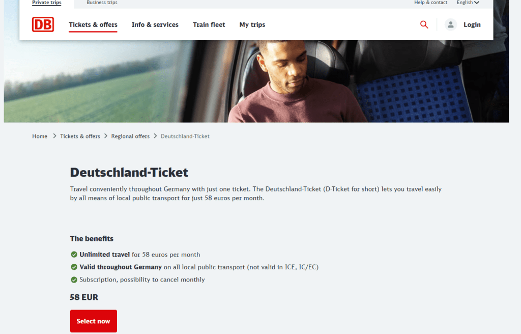 以前までは49€だったのですが現在は58€/月になっていて衝撃です(2025年) 要は鈍行の列車、バスであれば乗り放題なんです。これを購入して、QRコードを表示できれば切符を買わずに電車やバスに乗れます。ドイツに住んでいた友人に教えてもらいました。