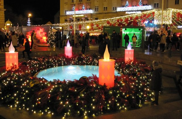 噴水の周りに大きなアドベントリースの装飾。4本のろうそくは、クリスマスまでの4回の日曜日(アドベント)を表しています。アドベントの最初の日曜日に1本目のろうそくを灯し、2週目に2本、3週目に3本、4週目に4本と、クリスマスが近づくごとに増やしていきます。暗闇の中で光が増していくことは、キリストの到来と希望を象徴しているそうです。