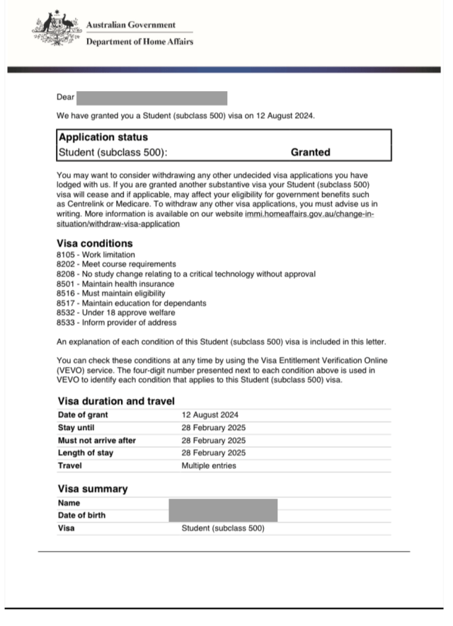 (2月に観光ビザにて渡豪、4月に申請、8月に受理、翌年2月末までのビザ↓)