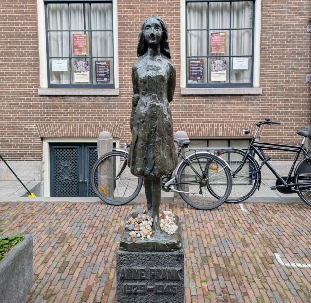 アンネの家から少し歩いたところに銅像があります。そのすぐ隣に建つのが、アンネの日記にも登場するウェステルケルク教会(Westerkerk)です。アンネは日記の中で、この教会の鐘の音を聞くことを心の支えにしていたそうです。