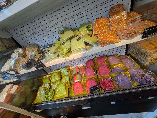 お店にはいろんなフレーバーのチーズもたくさん並んでいて、試食でお腹がいっぱいになります(笑)日本では見られないようなチーズが豊富、しかも値段もそんなに高くないのがいいですよね。