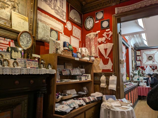 産業革命や機械化で大量生産のレースも登場したが、手作りレースの価値は依然として高く、こちらのようなレース専門店が、今も手作りの技術と伝統を伝える拠点になっています。