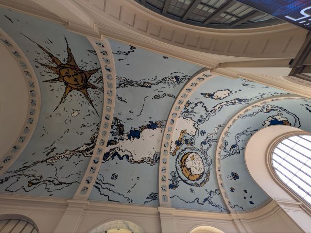 駅の中、天井の壁画です。この天井画は、ルクセンブルクの芸術家アルマン・ストランシャンプスによって描かれました。都市のスカイラインや星座をモチーフにした幻想的なデザインが特徴的で、綺麗な空色を天体を感じさせるのは個人的にはとっても好きなデザインでした。