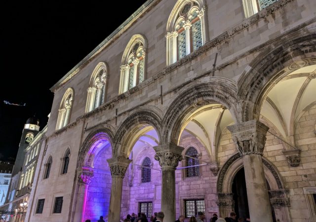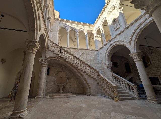 宮殿の中で有名な中庭は、行政機能の中心となる公共空間として設けられており、1435〜1442年の再建時に整備されました。四方をアーチの回廊が囲み、二層構造の吹き抜け空間があります。柱やアーチの細部には、ルネサンス初期の装飾(アカンサス模様や花飾り)が施されています。そしてここは音響効果が非常に良いらしく、毎年開催される「ドゥブロヴニク・サマーフェスティバル(Dubrovnik Summer Festival)」では室内楽コンサートやクラシック演奏の会場として使用されているそうです。今回の旅行中も夜になにやらコンサートが開催されていました。