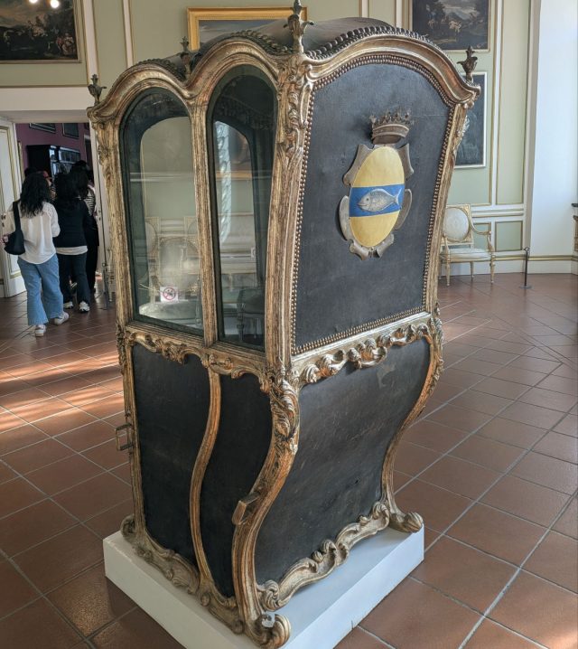 これはセダンチェアと呼ばれる当時高貴な人々が街中を移動する際に使用したものです。ジブリと、背部の魚の絵がかわいくて笑ってしまいました。恐らくもう一つのセダンチェアのほうが装飾も豪華だったのですが、お魚さんのいるこちらをあえてチョイスです。