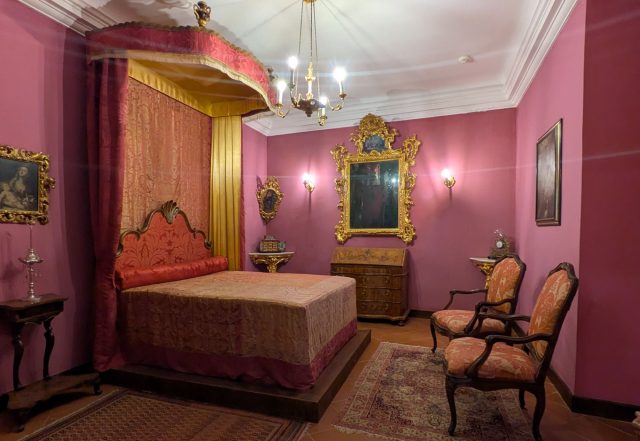 こちらのラブリーなお部屋はなんと総督の寝室です。先ほどにも書いたように総督の任期はわずか一か月ですが、宮殿から一歩も外に出られません。明るいピンク色は、ラグーサ貴族の典型的な色調だそうです。可愛らしいお部屋に見えて一か月間ここで国家の義務と孤独を象徴する部屋でもありました。