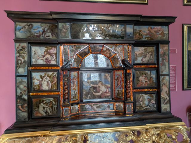 つづいてチェスト・キャビネットです。文字通り収納家具になります。主に衣類、貴金属、重要文書などを収納するために使われました。内側は松材などの軽い木で作り、外面に高価な素材を貼り、表面はワックス仕上げ、または金箔やラッカーで装飾されていました。まるで美しい絵画のようなこちらは単なる生活用品ではなく、家そのものの名誉を表す芸術作品として扱われていたそうです。