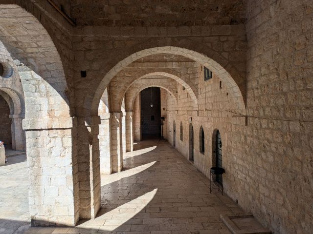 要塞の入り口から入ると広い中庭があり、その周囲に石造の部屋が並んでいます。