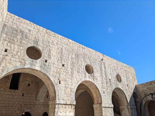 要塞の入り口にたどり着くまでにまあまあ階段を登ります。壁のくぼみにいる石像は聖ローレンス(St. Lawrence)という3世紀のローマの殉教者で、貧者を守る慈悲の聖人だそうです。当時の要塞や城門には、宗教的守護・防衛の象徴として聖人像を刻む習慣があり、オールドタウン内にもそのような装飾が見られます。特にロヴリェナツ要塞は「自由の砦」と呼ばれ、外壁の聖人像は「この地を神と聖人が守る」という象徴的意味を持っているそうです。