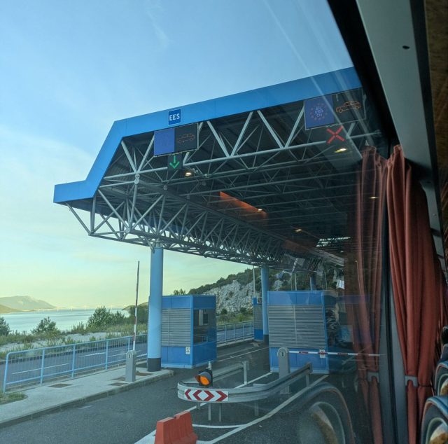 こちらは国境になります。バスの中でガイドさんがパスポートを回収して、コントロールに預け、スタンプが押されて返却されます。パスポートには車のマークのスタンプが押されていました。特に料金などは必要なく、パスポートのみで通過です。自分たちはバスで待機しているだけでした。