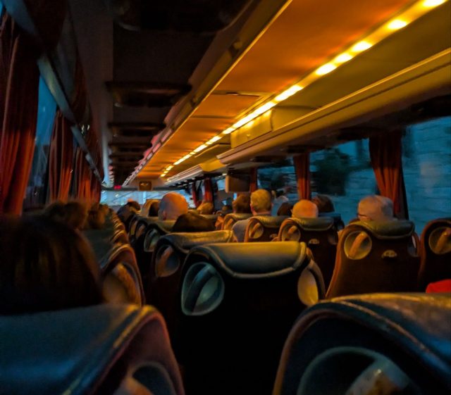 宿の前のバス停から大型のツアーバスに乗り込みます。席はほぼ埋まっていて、一番後ろの席に座りました。参加者はアメリカ、イギリス、オーストラリア系の国の方たちが多かった気がします(whatsappグループに追加されたのでそれぞれの電話番号が表示されていたのを把握)。外はまだ薄暗い感じです。