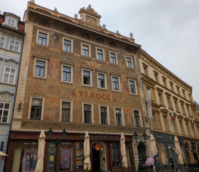 広場から少しだけ外れたところにまた目を引く外装の建物があり、なんとこれはハードロックカフェでした!この店舗は、歴史的建造物であるヴィー・ヤー・ロット邸に入っており、建物の外壁には ネオルネサンス様式のファサードとカラフルなフレスコ画と「V. J. Rott」の文字も刻まれています。ある意味ハードロックなのか(?)