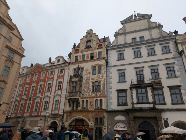 広場を囲むようにたくさんの建物があります。カラフルで綺麗なこれらはチェコの登録文化財として保護されている建物で、バロック様式を基盤としており、外壁・窓・装飾に17〜18世紀の改装が見られます。「Človíčků(小さな人たち)」という表記は、かつてこの建物の紋章・飾りに小さな人形や人影の彫刻があったことに由来する説があるそうです。
