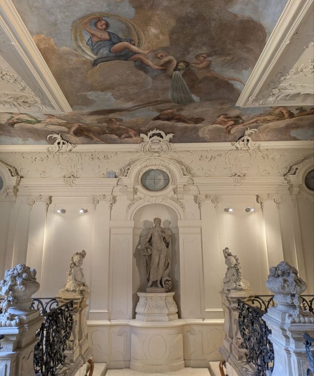 階段を登ると豪華な天井装飾と階段が、、このサヴァリン宮殿は18世紀後期に建てられた建築群の一部だそうで、後期バロック・ロココ様式の要素を併せ持つデザインになっています。
