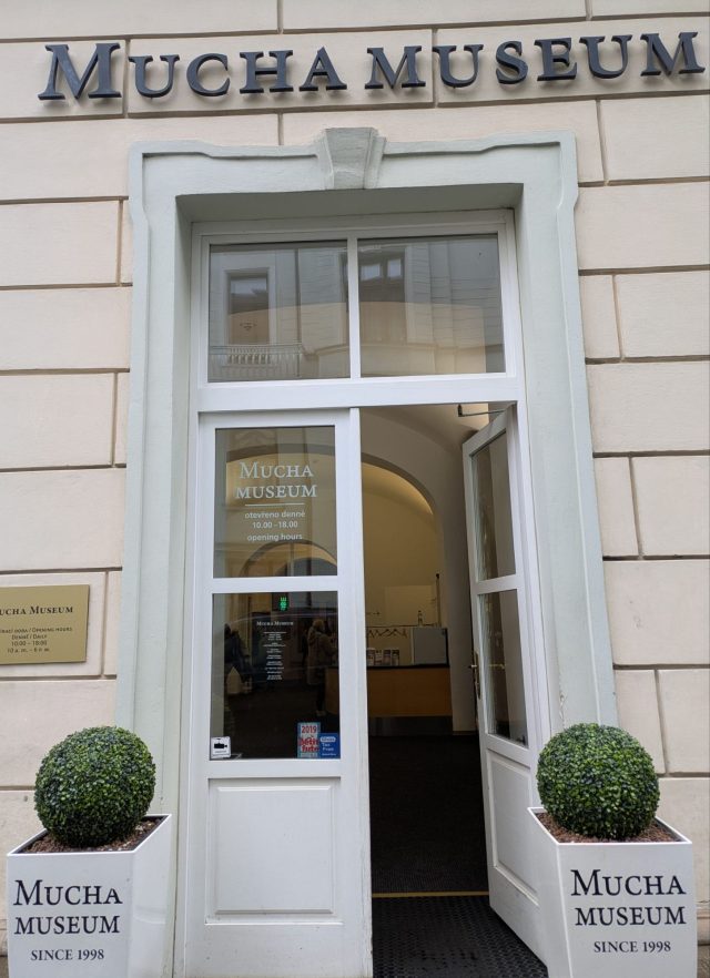 まず一つ目は1998年2月にオープンした世界で初めてのミュシャの美術館です。外観は結構シンプルで歩いていると通り過ぎるくらいの存在感でした。よく見ると窓に作品があります。
