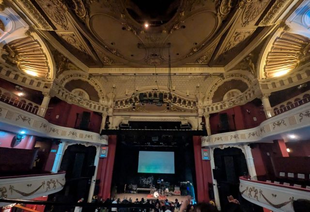 日本だと物販はライブの前後に行われている印象がありますが、今回は開場後にその場所で物販が開始。といったスタイルでした。チケットを見せて中に入ってやっと物販にありつけます。こちらの会場はA4サイズのバッグの持ち込みは不可。下はオールスタンド、上はシートのある席配置で、我々は上のシート席を選択。入場した瞬間から日本のライブハウスとは全く雰囲気が異なっていて、え、、?なんて贅沢な装飾、、。それもそのはずで、これは劇場建築家によって建てられた音楽ホールだからです。昔からのスタイルを現代も維持しています。こんなところで久々のライブに参戦できるなんて光栄すぎました。