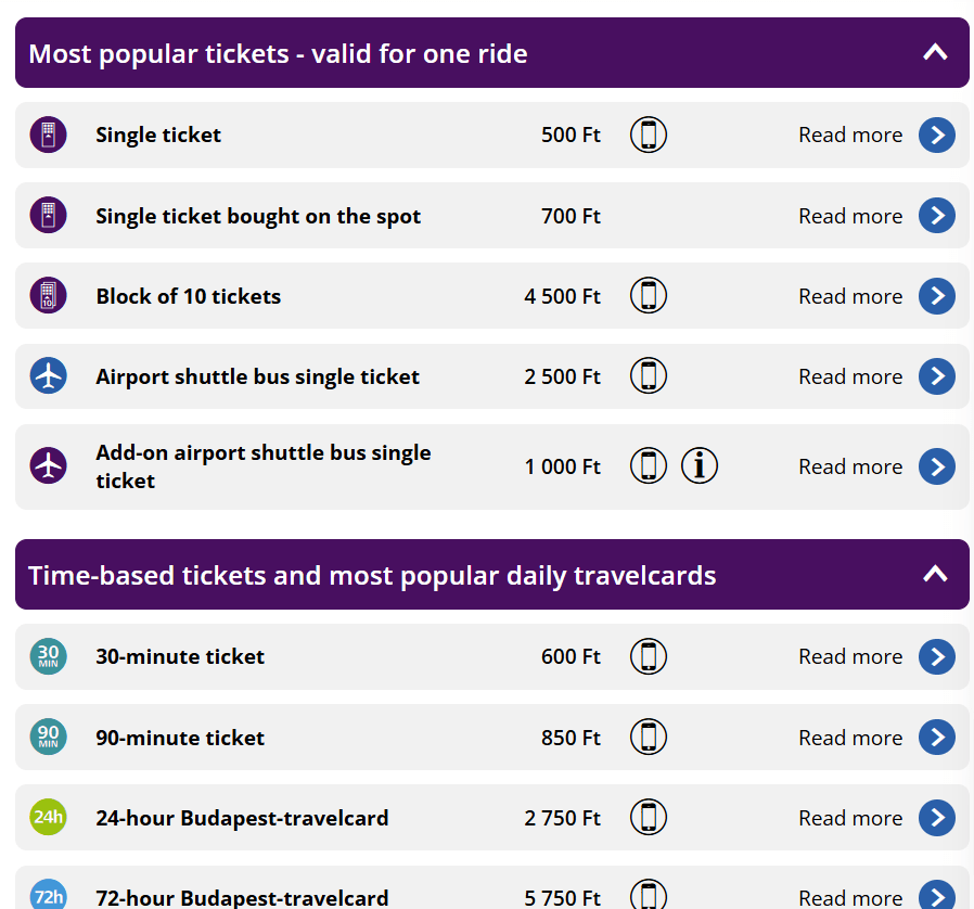 ・Single ticket(一回券):500Ft(約234円)
