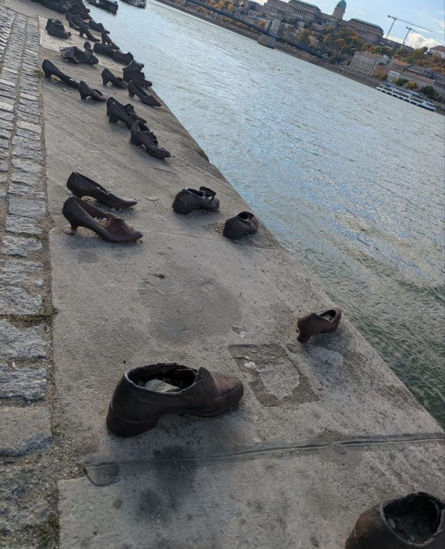 第二次世界大戦中、ブダペストでは 矢十字党(Arrow Cross) というファシスト部隊が、ユダヤ人などをドナウ川の岸辺で射殺する残虐な行為を行っていました。被害者たちは射殺前に靴を脱ぐよう命じられることがありました。靴は当時貴重なもので、略奪または売られることもあったと言われています。