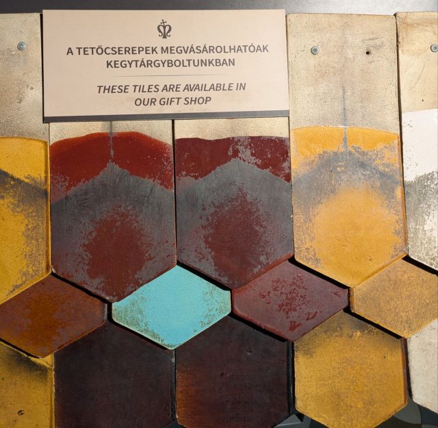 マーチャーシュ教会の屋根に使われているタイルのサンプルの展示もありました。この素材はZsolnay(ジョルナイ)タイルと言って、ハンガリーの名窯「ジョルナイ陶器工房」が製造したものです。エオシンと呼ばれる虹色の釉薬を使用し、高耐久性、アールヌーヴォー期にハンガリーで大流行し、ブダペストでは多くの建物がこのタイル屋根を使用しています。先ほど紹介した建築家のフリジェシュ・シュレクがハンガリー民族色の強いデザインを目指し、このタイルを教会の屋根に採用したそうです。