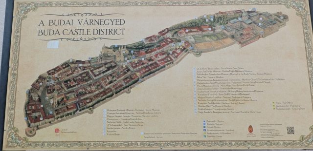 旧市街のマップが街中にありました。見にくいですが、、右側にブダ城、画面中央に漁夫の砦と教会があります。今回はブダ城から漁夫の砦に向かって散策した記事です。