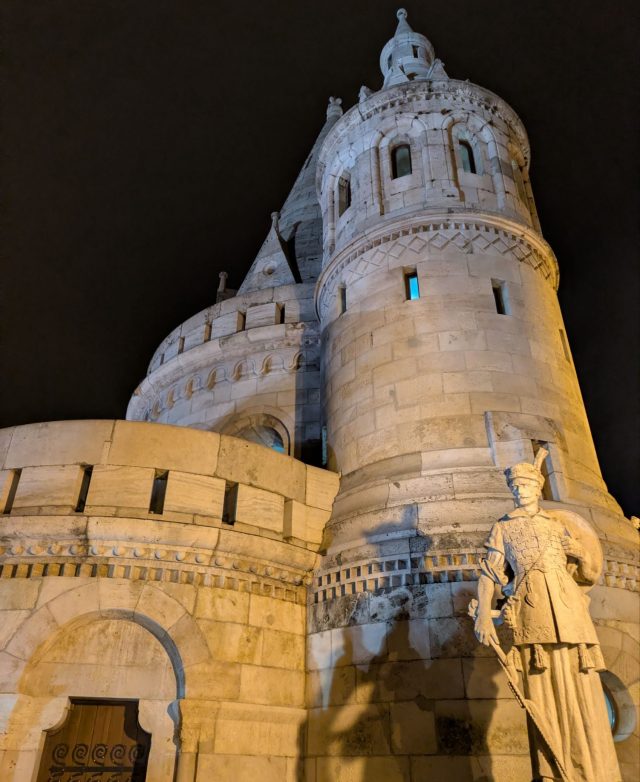 この手前の像に関する情報がきちんと見当たらなかったのですが、おそらくこれは「漁夫」を象徴したものだと思われます。いや、漁夫ではないかもしれませんがそう信じたいです。ブダペストで大人気の砦は日中も夜もすごく観光客がいました。