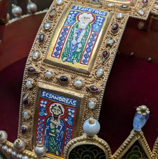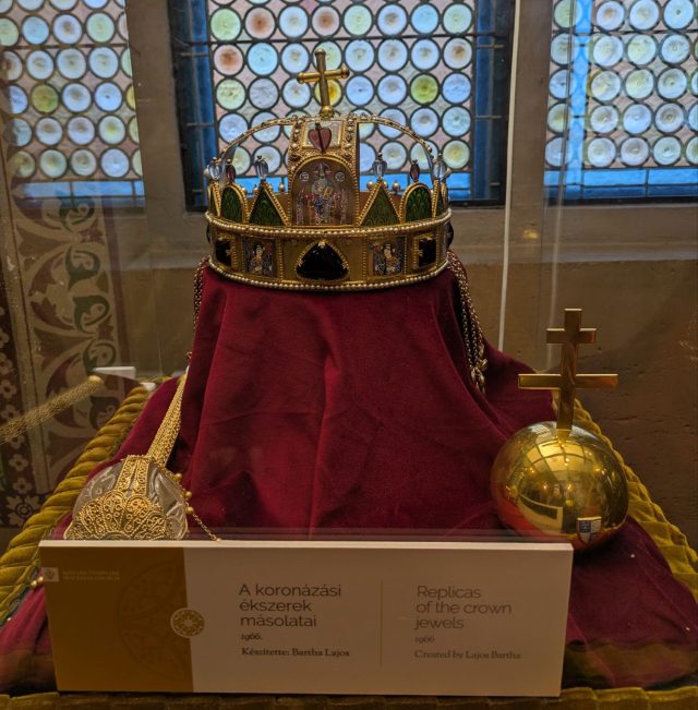 教会内部には様々な展示がありました。レプリカの聖イシュトヴァーンの聖冠と、王笏と宝珠です。ハンガリー王国の正統な王だけがかぶることを許された 国家の最高象徴で、「王権(国家)」を象徴する神聖なる存在とされていました。十字架が若干斜めに曲がっているのが特徴です。戴冠式などの歴史的儀式や国王、王妃との結びつきを象徴する展示物です。