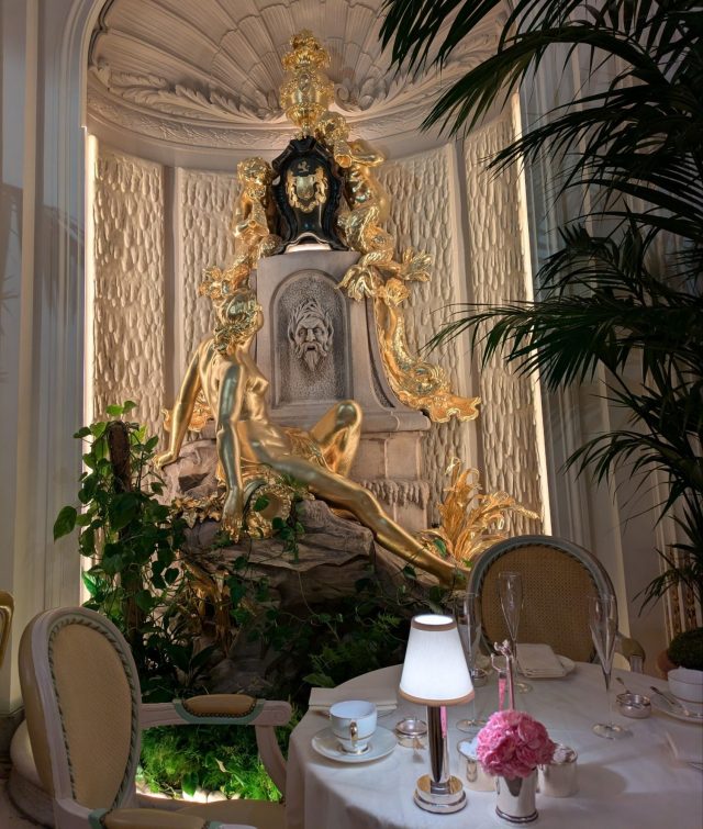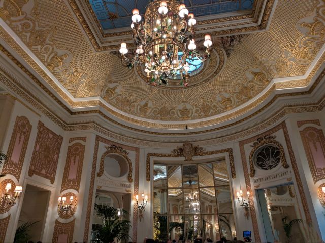 我々が案内された席はなんとパームコートのど真ん中の席でした。席に着いた瞬間に、「え?ど真ん中?大丈夫か?」と(笑) 後ろにあった彫刻?も金色で仕上げられていて、なんともゴージャス。終始きょろきょろしてました(笑)