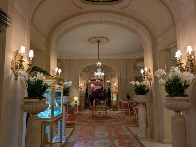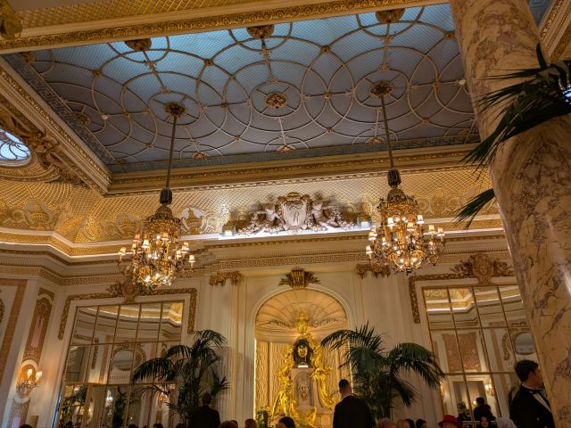 入口から圧巻の内装です。金色を基調にしたエレガントな装飾です。ホテル全体、特に地上階の公共エリアは ルイ16世様式 を基調にデザインされているそうです。宿泊となると超高いんだろうな~お金持ちばっかりなんだろうな~という庶民の気持ち駄々洩れです。