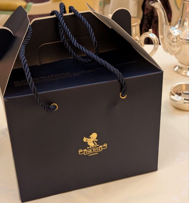 調子に乗ってサンドイッチをおかわりし、さらに一緒にいた人のスコーンも食べたので最初に運ばれてきたケーキは一つしか食べれず、、お持ち帰りすることにしました。持ち帰りの箱もリッツらしい高級らしさのあるものでした。