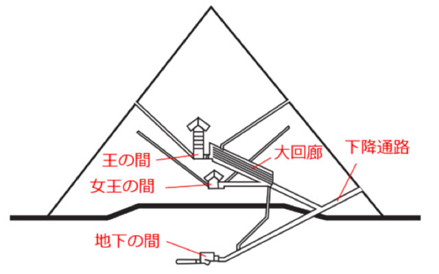 クフ王の父のスネフェル王の時代から地面より上に部屋が設けられるようになります。それまでの埋葬室は地下に埋葬されていました。地面より上に部屋があることにより、積載物で部屋が崩れる恐れがあったのですが切妻構造(三角屋根の構造)を用いることによって崩れることを防いでいます。クフ王のピラミッドが硬い石灰岩の上に建設されているのはスネフェル王のピラミッドが砂の上に建設したため地盤沈下を起こしたからだとされています。