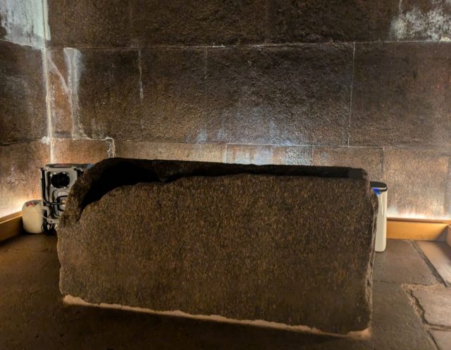 そして部屋の奥にある石棺です。約2.3×0.98×1.05mの大きさ、内部が繰りぬかれたような構造で、部屋の壁と同じ材質の花崗岩でできています。大きな石を削り、くり抜くようにして作られたらしいのですが、先にも言ったように硬さがあり加工がかなり大変、石棺から見つかった傷跡から、外側はのこぎり状、内側は筒状のドリルのような道具で圧し切って作られたと考えられています。当時の鉄は銅のみで、二人で一日10時間働いた計算で9年かけて一つの棺が出来上がる計算になるそうです。発見されたときは石棺のみ、箱の中身は空でした。
