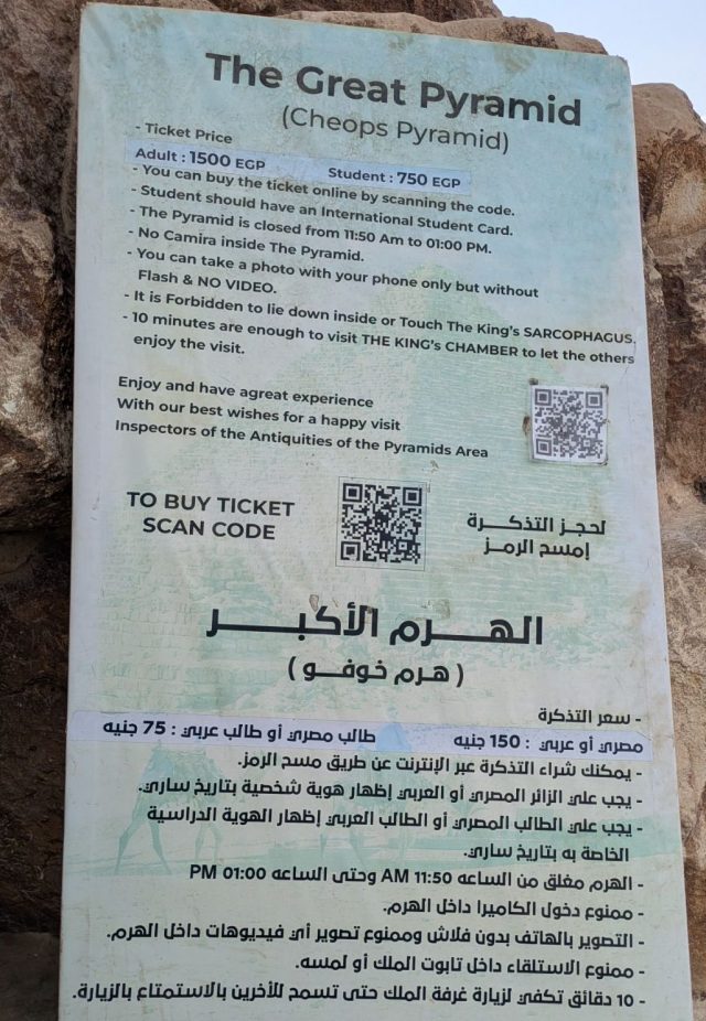 ピラミッドの陰で座って再開を待っている間に、物や水などを売りつけに来る人々に絡まれます。我々は日よけのためと、自分たちのエンターテインメントのためにヒエログリフ模様の描かれたザ・観光客!なストールを購入して頭から被っていたのですが、物売りの優しそうなお兄さんがそれを「貸してごらん」と言って勝手にするっと奪い、頼んでもないのにターバン風にして頭に巻いてくれました。そしてチップを要求してくるパターン。やられたー。細かい紙幣を持っていなかったので、二人で10EGPだけ渡しました。これは少ない金額なのは承知でしたが「これは日本円でどのくらいの価値か知ってるのか?あとEGP20ずつだ。」などと言ってきます。このやり方が文化なのは分かりますが要求してくることにイラっとした私たちは「もう紙幣は無い」と一点張りして追い払いました。最近はどの国でも、その国の文化が嫌なら来るなと言うのを耳にしますが、エジプトなのに日本円でどのくらいの価値か諭してくるのはまた違うのでは?彼ら自身で文化を悪用しているようにも捉えてしまいました(というか半ば強制的に人の物奪って勝手に頭に巻いといて何なんだよ逆ギレ状態、頭に巻かれているときに断ればよかったが良い人だと思ってしまった)。そんなことをしていたら時間になりオープン!