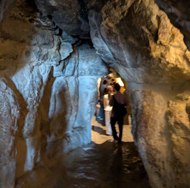 この道からはもともと存在した正規の通路だと言われています。木の板や手すりで舗装されていますがただの坂道で角度は約26°、大人は腰を曲げてかがんで登らなければならず、足腰力が必要でした。人を映していませんが、登っているときは前の人のお尻しか見えない感じです。そしてとっても狭いので帰ってくる人とは道を譲りあわなければならないほどの幅で、小柄なアジア人たちにとってはまだ大丈夫かもしれませんが、体格のいい欧米、中東系の男性たちにとってはとっても大変そうでした。距離は約40mですが、腰を曲げて少しずつしか進めないのでかなり長く感じました。