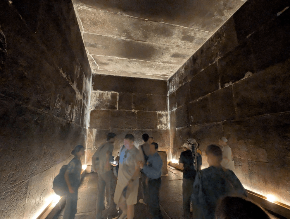 やっと王の間へたどり着きました!高さ・幅は約5~6m、奥行きは約10mほどの部屋で、ピラミッドの表面の石材は石灰岩なのに対し、こちらの部屋に使われている石は花崗岩と言ってエジプトの南にあるアスワンという地域でしか取れない、しかも加工がものすごい大変な石でできているそうです。この上には重量拡散の間という空間があり、王の間が重力で崩れたり潰れたりしないようにするスペースがあり、とある情報では2017年に名古屋大学の研究チームが特殊な方法を用いてピラミッドを透視した結果、王の間付近にまだ大回廊に匹敵する30m程の空間があることも発見しているらしいです(日本の研究チームすごい、、)。まだまだ解明されていないピラミッド、、。中にこんな風な部屋があるなんて、、というか入れたことに本当に感動しました。本当にサウナの様なところでしたが、暑さより感動が勝りました。