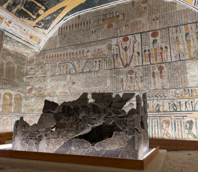 ラムセス6世のミイラが眠っていた玄室です。こちらに来ると壁画たちがさらに豪華になります!しかし近くには行けないので遠目からになります。ばらばらになっていたものが修復されたラムセス6世の石棺があります。