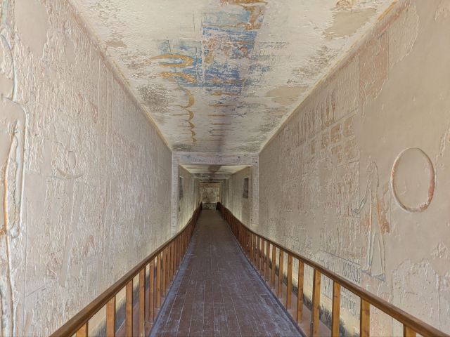 まず入り口から衝撃、、、!!!!(‘Д’)(‘Д’)まっすぐ長い廊下が続いて、壁と天井にはびっしりと文字や絵が刻まれています。第20王朝のラムセス5,6世の時代は入り口が分かりやすく、かつ入り口の上にも誰の墓か明記してあります。谷自体を傭兵部族に守らせていた時代です。