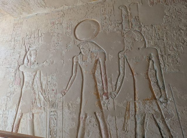 それにしても色がとっても綺麗なのですが、これは当時のままです。壁、柱、天井すべてに「洞窟の書」と玄室に近づくにつれ「アム・ドゥアト(冥界の書)」が描かれるようになります。ちなみに天井は天空の女神ヌト神が太陽を飲み込み、また太陽を生み出すシーンが描かれています。