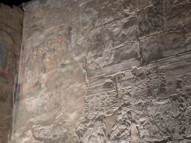 列柱室を進み、至聖所の前に行くと少し開けたスペースがあります。前室と言われる場所なのですがここにも見どころがありました。向かって左側の壁画をよく見ると、エジプトのヒエログリフではなく、その上から漆喰が塗られ、ローマ時代のフレスコ画(漆喰の壁に画かれた絵)を見ることができます。うっすらと4人のローマ人の顔があり、彼らはローマの指導者だったのではないかとされています。