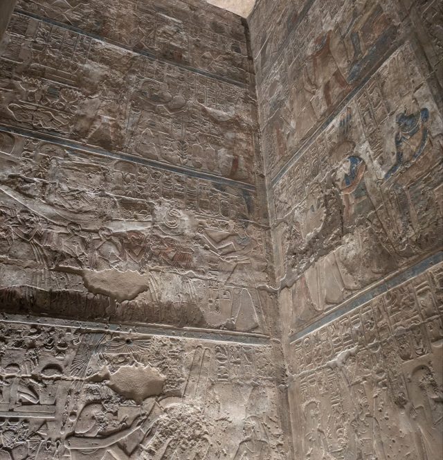 中庭向かって右側の壁にはラムセス2世の息子たち17人のレリーフがあります。彼は有名なネフェルタリ含む8人の王妃と多くの側室たちがいて、子どもたちはなんと100人を超えていたそうです。そしてラムセス2世は約66年の治世で当時のエジプトの平均寿命が40歳ほどだったのに対し90歳近くまで生きたとされており、息子の方が早く死んだと言われています。長く生きたからこそ多くの建築物を残すことができたんですね。彼の死後は13番目の息子であるメルエンプタハが跡を継ぎ、ファラオになりました。