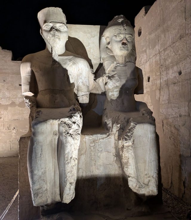 ツタンカーメンの王墓からは様々な遺物が見つかっているのですが、中には彼の座っていた椅子が見つかっていて、そこにも王妃との絵が描かれているそうです。私がこの像を見て思ったことは、二人は仲が良くて、体の弱かったツタンカーメンを献身的に支えた妻への感謝も込めて同じ大きさの座像としてここに姿を残したのではないかと思っています。真意は不明ですが勝手にほっこりしました(私の想像と感想です)。