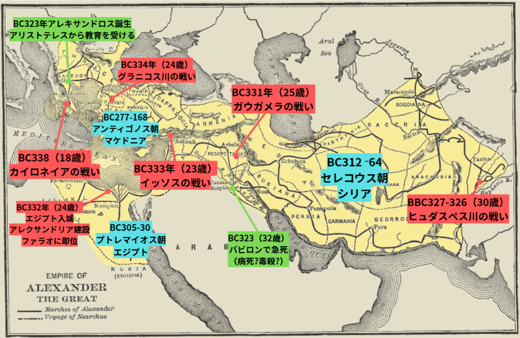 BC332年(24歳):エジプト入城、アレクサンドリア建国、ファラオに即位。