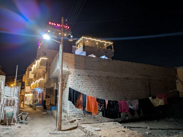 レストラン周辺の様子です。その辺に洗濯物が干してあるのも面白いというか、他の国でもあまり見ない光景でした。上に光っている看板がレストランです。
